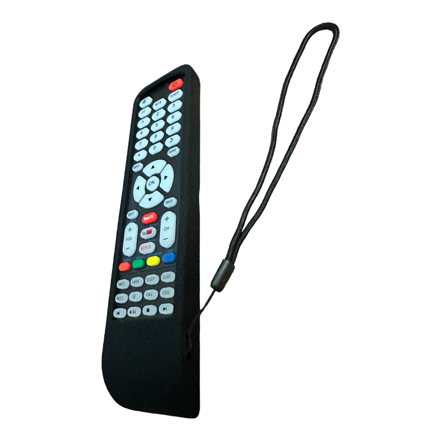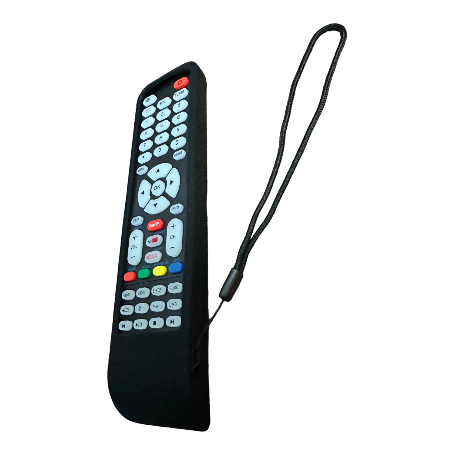 Funda Protectora De Silicona Universal Compatible Para Controles remotos de Pantallas Smart TV. Si tu control remoto, es como el que aparece en la imagen de ejemplo con la funda, seguramente es compatible con la misma. *NO INCLUYE CONTROL REMOTO* ÚNICAMENTE FUNDA DE SILICONA CON CORREA PARA SUJETAR. Características: Material Duradero, Antideslizante, A Prueba De Golpes, Anti caídas, Resistente Al Agua. Dimensiones aproximadas: 20.5cm x 4.8cm (puede existir una muy ligera variación). Descripción: 1. Fabricado Con Silicona De Alta Calidad Para Proteger Tu Control Remoto Del Polvo, golpes y Los Rayones No Deseados. 2. Fácil De Usar Y Ligero, además Proporciona La Máxima Protección, Antideslizante, Anti polvo, A Prueba De Golpes Y Lavable. 3. Ajuste Perfecto: El modelo compacto Y Ajustado De La Carcasa Protege Tu Control Remoto A La Perfección. 4. Fácil De Instalar: Simplemente, Desliza Tu Control Remoto. INCLUYE: 1 FUNDA DE SILICONA UNIVERSAL PARA CONTROL REMOTO DE PANTALLAS SMART TV.